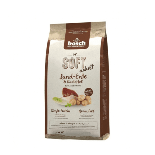 bosch Soft Land-Ente & Kartoffel ist ein single Protein-Produkt für die ausgewogene Ernährung ausgewachsener Hunde aller Rassen. bosch Soft Land-Ente & Kartoffel ist durch seine weiche Krokette (höherer Feuchtegehalt) und seinem hohen Anteil an frischer Land-Ente (min. 60 %) als alleinige Proteinquelle besonders für Hunde geeignet.