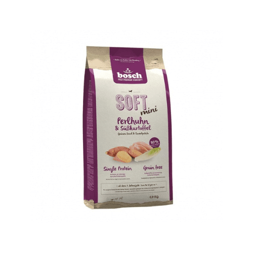 bosch Soft Mini Perlhuhn & Süßkartoffel ist ein Single Protein-Produkt für die ausgewogene und gesunde Ernährung ausgewachsener Hunde kleiner Rassen (Endgewicht bis 15 kg).